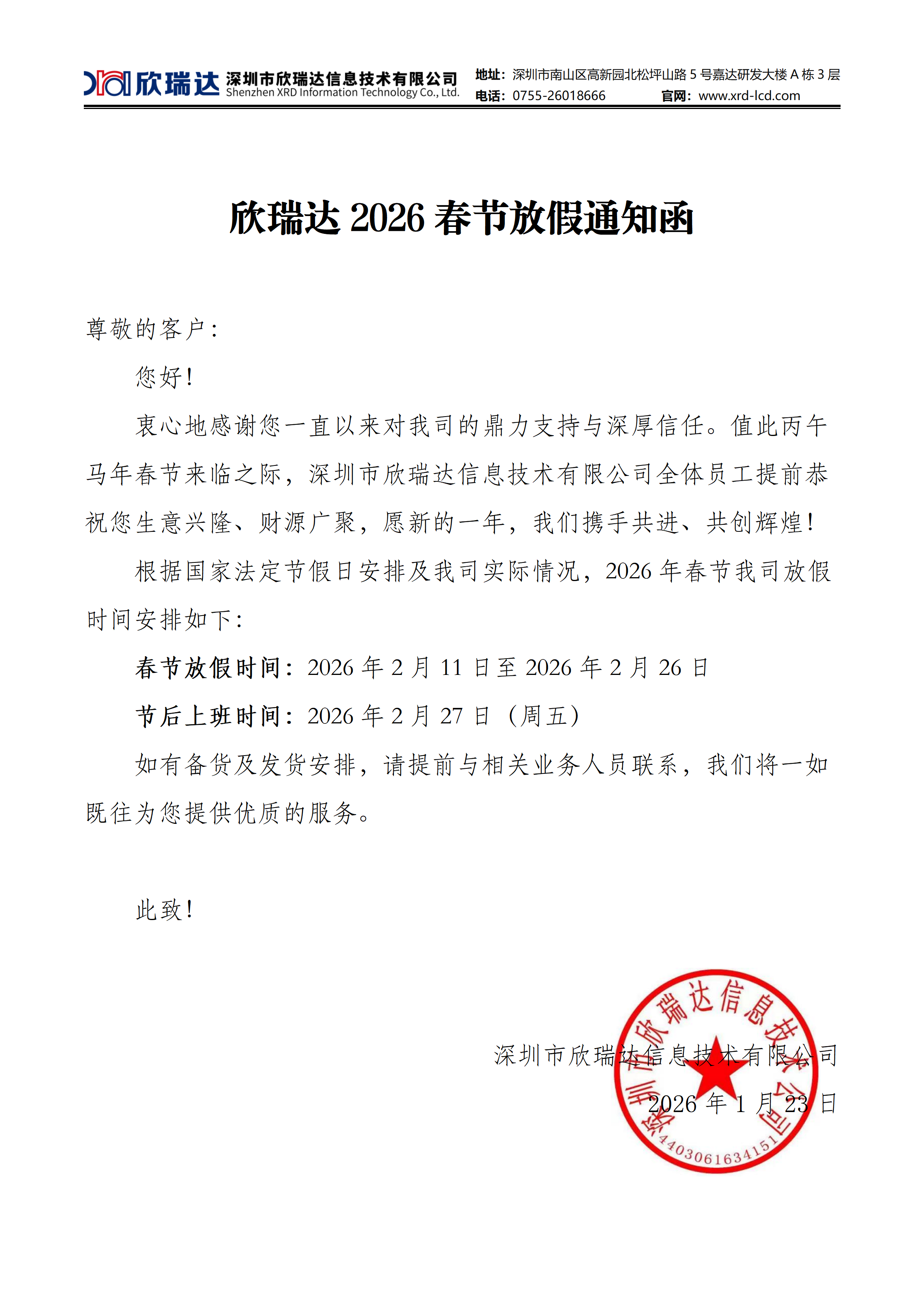 欣瑞达2026春节放假通知函