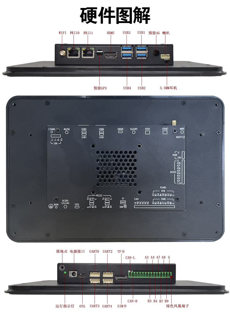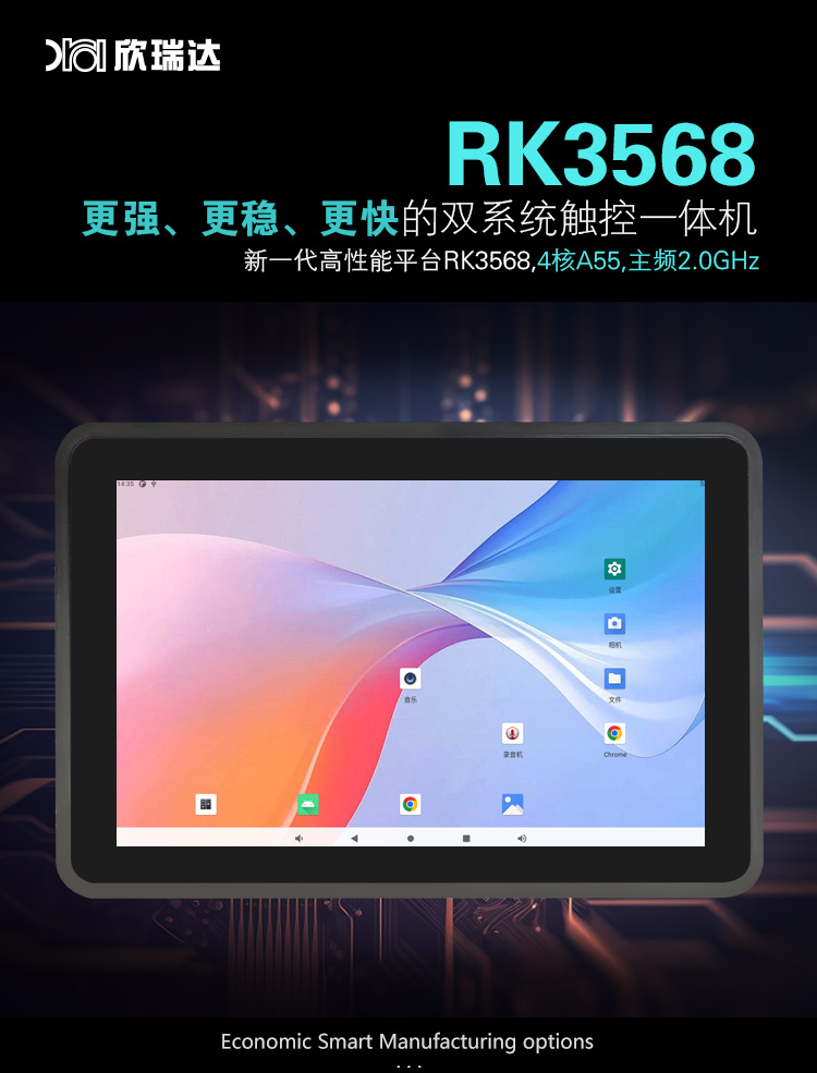 特点描述:XA101GHM15W(B)系列,是欣瑞达基于ARM 4核A55架构自主研发设计的一款工业安卓智能触控显示终端,由底板、LCD显示屏及触摸屏组成。 搭载瑞芯微RK3568四核处理器,安卓V11操作系统,支持自主设计APK程序安装;全新丽色显示系统,支持自主调节冷暖色调;支持4K视频播放, 支持1080P视频通话、200万双摄; 接口资源丰富, 用户可通过 RS232、RS485、CAN等串口端口与外部设备进行通信;也可以通过WIFI/4G/以太网联网、浏览网页、播放音乐、播放视频、远程升级更新等。