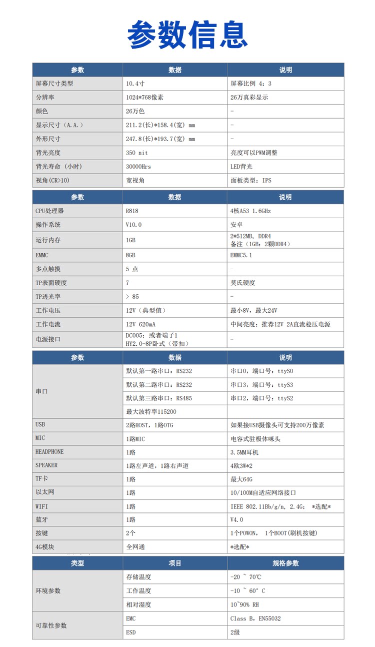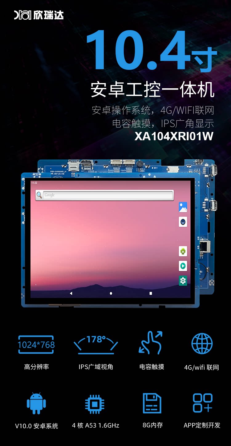 特点描述:XA104XRI01W系列,是欣瑞达基于ARM A53架构自主研发设计的一款工业安卓智能触控显示终端,由底板、LCD显示屏及触摸屏组成。 搭载全志R818四核处理器,安卓10.0操作系统,支持自主设计APK程序安装; 全新丽色显示系统,支持自主调节冷暖色调;支持4K视频播放,支持1080P视频通话、200万双摄;接口资源丰富,用户可通过RS232、RS485、CAN等串口端口与外部设备进行通信;也可以通过WIFI/4G/以太网联网、浏览网页、播放音乐、播放视频、远程升级更新等。