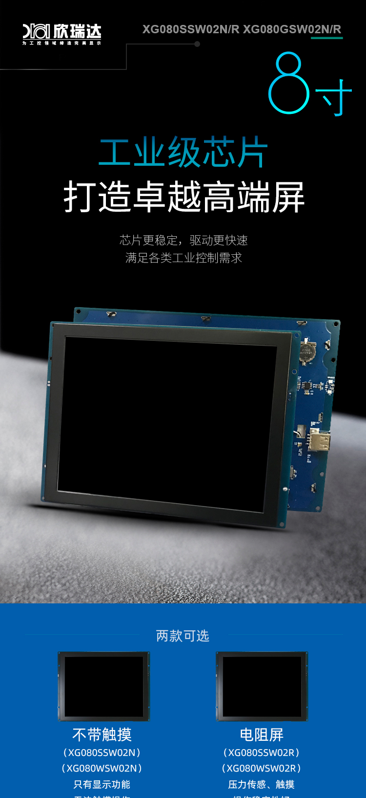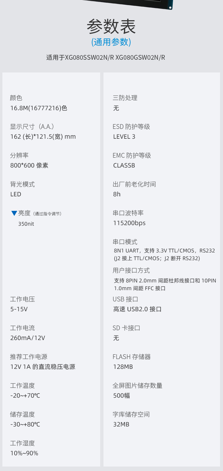 特点描述:XG080XSW系列产品搭载欣瑞达SGUS(超级图形应用软件)系统,是基于欣瑞达串口屏硬件平台研发的拥有自主知识产权的智能图形显示系统。用户可通过SGUS串口智能显示终端轻松实现触控功能, 如数据文本录入、按键值返回、增量调节、弹出菜单等;也可以快速实现显示功能,如表盘时钟、图标变量、艺术字、曲线显示、列表显示、文本显示等。